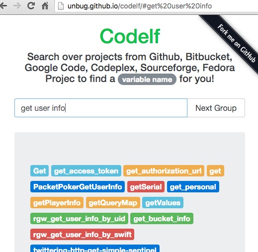 Codelf通過搜索在線開源平臺Github, Bitbucket, Google Code, Codeplex, Sourceforge, Fedora Projec的項目源碼,幫開發者從中找出已有的匹配關鍵字的變量名。這個搜索服務支持直接搜索中文。codeif支持中文查詢,輸入中文意思,codeif可以根據需要查詢盡可能滿足需要的結果,并展示與查詢結果相關的支持各種編程語言的代碼片段以及代碼庫。